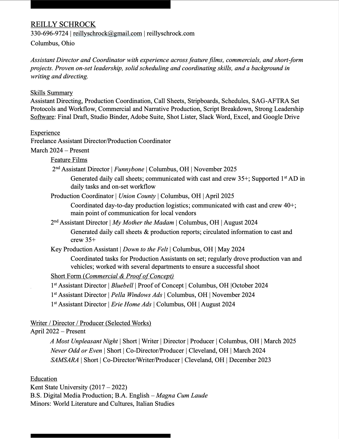 An experienced Assistant Director, Coordinator, and Lighting Technician with experience in feature, commercial, and short form projects. Please see below for the most up to date resume.